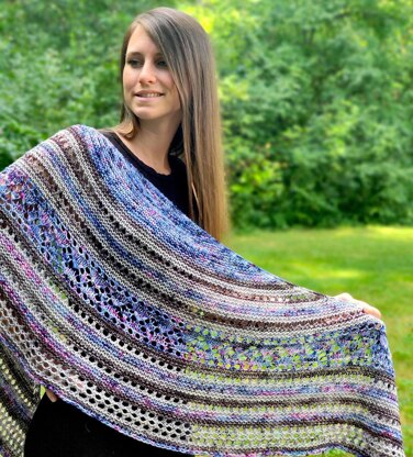 Pattern is written, the construction is top-down, approx. gauge is 18 sts and 42 rows to 4." and my final measurement was 20” at widest depth by 86” long tip-to-tip (I am an aggressive blocker!)