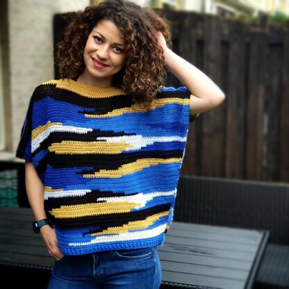 This Dreamscape Tee Pattern uses techniques like half double crochet, increase and color work. You will need to know front post and back post double crochet for the ribbed band.