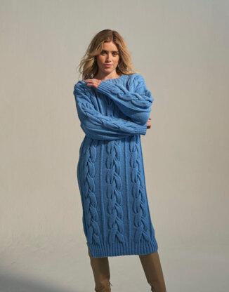 The stunning giant knitted cables of the Estuary Sweater Dress are inspired by the place where a wandering river meets the sea. This advanced knitting pattern is ideal for a more experienced maker. Knit in a water-inspired shade of soft Sirdar Loveful 100% Recycled Acrylic, spun from GRS-certified 100% recycled fibres.