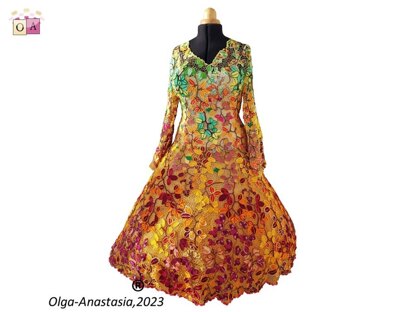 Modern crochet Irish lace pattern - Dress with crochet sleeves "Autumn" . A detailed pattern for all crochet motifs - a graphic diagram, a photo and a verbal description of each crochet row. PDF file for 71 pages. Design work by Starostina Olga.