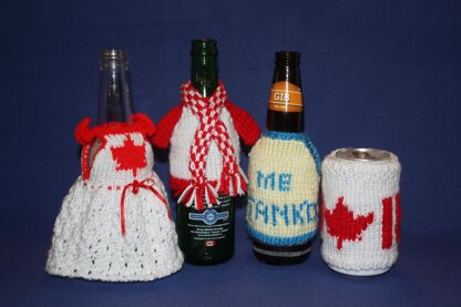 With Fathers Day and Canada Day on my mind, I have designed these beverage container covers. Not only will they bring a smile to the face of those at the picnic but they will amuse and entertain. The "I (Heart) Dad" sweater with the red and white scarf is in honour of all the fathers at the party and is an easy knit in Bernat Satin or any other bits of yarn from your stash. The Blue and Yellow tank top with the logo "Me Tank'd...No!" is sure to amuse the muscle builders around the table as they down their cold one. The Canadian Flag is in honour of Canada Day and fits all regular sized cans. The mate to the patriotic can cover is the wee frilly dress with the maple leaf on the bodice. The pdf contains all the charts for the intarsia as well as the line to line description to knit the logos. Easy knits.. and a good chance to use up more of your stash bits and bobs that are just not enough for anything else.