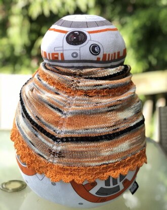 Droid, please. is a smallish, half-circle shawl that uses a BB-8 colored yarn for the main color (BB-sheep by Lazer Sheep Yarns). This pattern is a relaxing knit with a few cables to keep it interesting. Your finished shawl is immediately recognizable as everyone’s favorite droid. Any Star Wars fan would love to wear it!