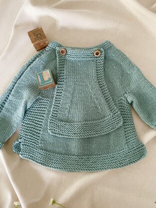 The sweater is knitted in sport weight or a light DK yarn. The bib can be knitted in the same yarn, or a cotton/cotton blend for a more moisture absorbent garment.