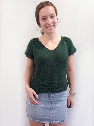 The Drop Vee Tee is a V neck tee design with drop stitch detailing along the sleeves and the bottom hem. It is worked top down raglan style in stockinette. It is designed for short cap sleeves, though you could easily add length if you prefer a longer sleeve. The tee is designed to fall at hip level, but can easily be customized to a shorter or longer length! It is meant to be a bit of a boxy fit, but the pattern will have options for waist shaping if desired. This is a #sizeinclusive pattern, and is designed for 1-6” of positive ease.
