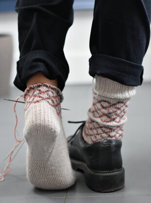 Yarn used in sample (size 2) is 1 skein of Kremke Soul Wool Lazy Linen (80% wool; 20% linen; 420 m 459 yds / 100 g) in colourway 02 as main colour and 1 skein of RiverKnits Chimera (100% BFL wool; 195 m 213 yds / 50 g) in colourway Fire as contrast colour.
