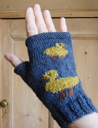 PDF knitting pattern for a pair of fingerless mitts/gloves with ducklings in various sizes on both tops and palms.