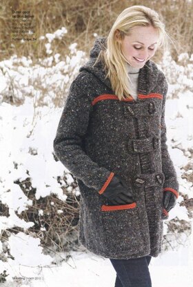 This is a pattern for a Duffle Coat, originally published in Knitting magazine. It is in stocking stitch with garter stitch edges, a hood, and toggles with tabs. There is a contrast edge. Main yarn 100 gm balls. Photos Laurel Guilfoyle for Knitting Magazine.