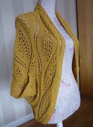 Oversized cardigan / bolero with short sleeves knitted in one piece side to side. The fabric drapes elegantly and makes the piece perfect for spring / summer. Great for a beach if knitted with 100% cotton yarn.