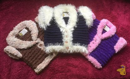 Smart button up vest, a bold simple pattern with soft matching border and cap sleeves. Knitted on 4.5mm (US7) and 5.5mm (US9) needles in Worsted /Aran yarn. To fit Chest 16 -24” (40- 61 cm) with overall finished sizes chest 18 to 25 1/2 inch (45 - 65cm) , length of back 9 1/2 to 13 1/2 inch ( 24- 35 cm).