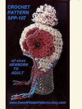 VERY EASY Chunky Style Ear Flap Hat. Optional pom pom and flower! ALL SIZES FROM NEWBORN TO ADULT IN THIS ONE PATTERN!! A great pattern to have on hand, as you can make a basic beanie with this pattern, a plain ear flap hat, a dressy hat with a flower, or over the top with a pom pom!! You will need a 9 mm crochet hook, and worsted weight yarn. This pattern is worked with 2 strands of worsted weight, you can use chunky yarn as a substitute. You will need to know chain stitch, and single crochet. Step by step photos also included in the pattern.- Hersteller