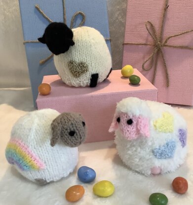 This knitting pattern is for 3 Easter Sheep Chocolate Orange Covers, they are ideal for Easter gifts and are suitable for children over 3 years of age. You will need 3.5mm needles for the Sheep with Gold Heart and 3mm and 3.5mm for the other 2. You will need King Cole Big Value DK or King Cole Truffle yarn for the Body and Big Value DK for the trim. Also Lincatex Gold Rush for the Gold Heart, a little toy stuffing for the Head and a Chocolate Orange. The finished items measure approximately 9cm high.