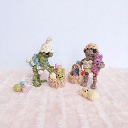 Dress up your tiny frog and toad in this cute hatching chick or bunny Easter outfit, complete with a little basket, mini Easter eggs, and Easter bunny peeps! This outfit is designed to fit both the tiny frog and the tiny toad (patterns available in my shop, Poppet Moon Crochet).