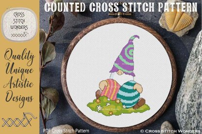 An Adorable Easter Gnome counted cross stitch design!\nCross Stitch Pattern designed by Marcia Manning.\n93 stitches wide by 120 stitches high.\nPDF is a COLOR counted cross stitch chart which lists suggested DMC floss colors, and includes a color picture.\n\nStitched design size is as follows:\nSize 11 count: 8.45 x 10.91 inches or 21.47 x 27.71 cm\nSize 14 count: 6.64 x 8.57 inches or 16.87 x 21.77 cm\nSize 16 count: 5.81 x 7.50 inches or 14.76 x 19.05 cm\nSize 18 count: 5.17 x 6.67 inches or 13.12 x 16.93 cm\nSize 22 count: 4.23 x 5.45 inches or 10.74 x 13.85 cm
