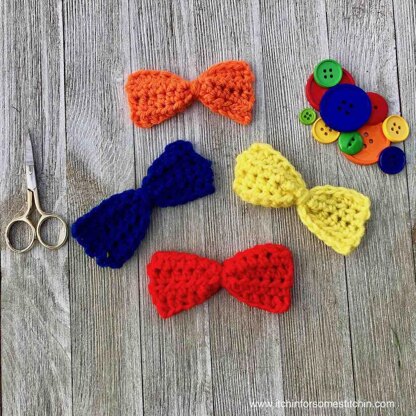 These cute little crochet bows are so easy even the newest of crochet beginners can do them! They can be done in 3 easy steps and 10-15 minutes flat. Easy peasy! Perfect for bowties on clothing or pet coats, hair accessories, or simply to adorn your other crochet projects like bags, headbands, gloves, beanies and more. You can even tie them to the top of presents for a unique gift bow. Make them up in your favorite colors and add them to your favorite projects for a fun and festive look!