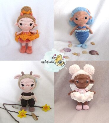4 Dolls crochet patterns/tutorials : Mermaid, Fairy, Fauna and Ifrit (size about 20 cm) : indications, photos, diagram and tips