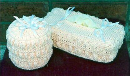 This is so pretty, and unique! A fluffy, puffy stitch pattern creates a neat looking tissue box holder and toilet tissue cover! You will have fun knitting this fun patterns stitch as you watch the puffs develop right before your eyes! This is fairly easy to knit, using US # 9 and # 11 needles. Uses worsted weight cotton yarns. This is a very easy to remember 8 row repeat! Make some of these sets for gifts for your friends!
