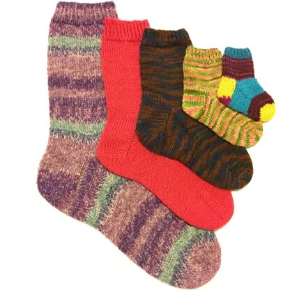 Sizes include; Mini, Baby, Toddler, Child, Adult Small, Adult Medium and Adult Large. The mini size is a sample sock, great for learning the process or as a key chain or mini Christmas stocking.