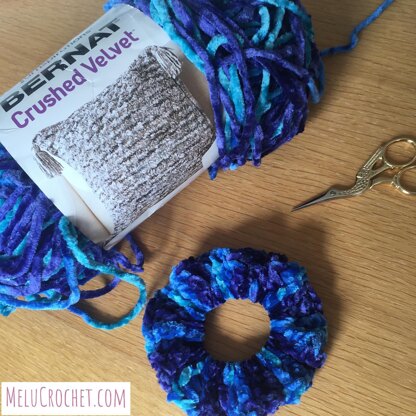 - Elastic hair band, 5.5mm hook, Approx 15g Bernat crushed velvet chunky/bulky yarn, yarn needle, scissors