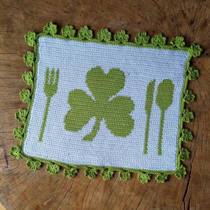 The placemat is crocheted with sc stitches and tapestry crochet technique. Hdc and tr stitches are required just for the shamrock border.