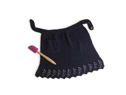 Apron is worked in 3 pieces and sewn together. Skirt is worked side to side with a lace border and sewn to the waistband strip.