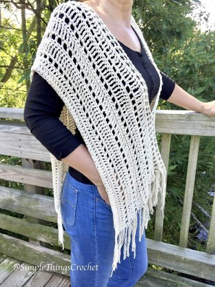 This is an easy poncho pattern that’s great for beginners. It’s a perfect light cover-up for warmer weather. I think it would be awesome at the beach as a swimsuit cover-up. This is just the solid color version of my Pastel Summer Poncho. I love that one, but I can wear this with more things. If needed, you can easily make it a little longer by making a longer beginning chain. Just be sure to make it an even number.