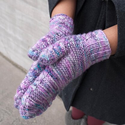 Cozy mittens that keep it simple on the front and back, but have some pizzazz around the edges. A cable lines the entire outer edge of the mitten including the cuff, thumb and tips of the fingers. The cable is set against squishy garter stitch which makes these mittens an excellent choice for showing off some really fun yarn. Knit these up quickly using just one skein of worsted weight yarn.