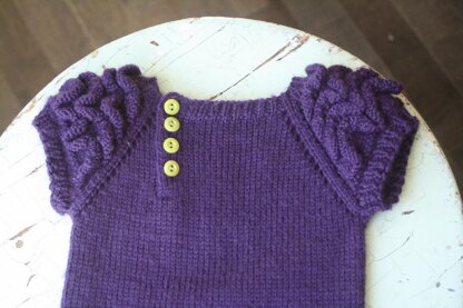 Edith is a sweet baby sweater with puffed, ruffled sleeves, an offset button band, and optional ruffles along the bottom. Perfect for newborns to 2 years old! (With an older version in the works!)