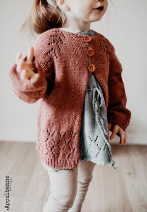 Edla Kofte ist ein süßer, schlichter Cardigan im nordischen Stil für kleine und und große Mädchen. Die elegante Raglanlinie und das schöne Ajourmuster am unteren Saum, sorgen für das gewisse Etwas und jede menge Strickspaß.