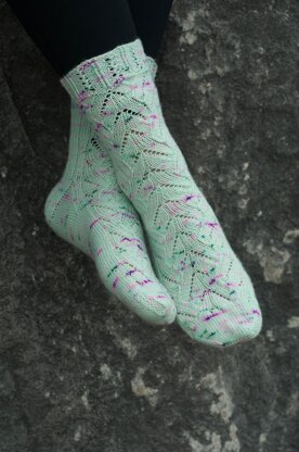 Light and airy, Effervescent will have you bubbling over with knitting enjoyment. These socks are worked from the top down, with a predictable lace pattern that gives the appearance of bubbles floating up the leg of the sock. A traditional heel flap gives way to a non-traditional gusset along the bottom heel, while ribbing along the back of the leg makes for a perfect fit. Suburban Stitcher’s hand-dyed yarn creates a perfectly playful pairing without overwhelming the design. Does life have you grounded? It’s time to Effervesce.