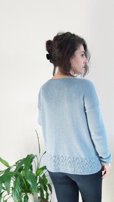 EGEO is an oversized, seamless pullover knit from the top down. The back is knit from the provisional cast on at the shoulders. The two fronts are knitted in the opposite direction from the provisional cast on too. At the underarms the garment is joined in the round and the sweater is continued to the desired length. The stitches along the armholes are picked up and the sleeves are knitted top down. A beautiful lace section embellishes the entire project.