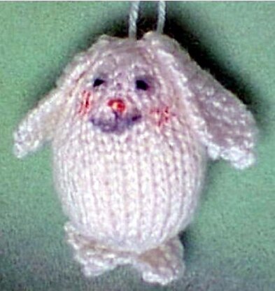The entire bunny is an egg shape! Easy to knit, then add simple ears, face and you are done! You can knit up several of these in an afternoon. Why not get out the miniature tree, and hang these bunnies all over it. They you will have a cute conversation piece at Easter! Let each child take home a bunny after dinner! Uses sport weight yarns, knitting needles, US # 4. Finished size is about 2½ inches tall.