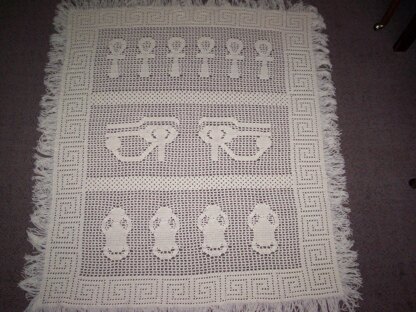 This absolutely gorgeous Egyptian sampler afghan is my crowning design achievement. It took me almost six months (on and off) to design and make. I spend another two weeks finalizing and checking the instructtions. The instructions are completely written out, so you will not have to count holes and blocks from a diagram. The border designs are authentic ancient Egyptian pat-terns. It will add a touch of the exotic to your bed. It is designed for a double-size bed and covers the bed completely. It is made with worsted weight yarn. It takes quite a bit of time to make, but it is well worth the effort.