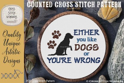 A great DOG saying!\n\nEITHER YOU LIKE DOGS OR YOU'RE WRONG\n\nDesign by Marcia Manning.\n\nDesign is 128 stitches wide by 80 stitches high.\nSize 11 count: 11.64 x 7.27 inches or 29.56 x 18.47 cm\nSize 14 count: 9.14 x 5.71 inches or 23.22 x 14.51 cm\nSize 16 count: 8.00 x 5.00 inches or 20.32 x 12.70 cm\nSize 18 count: 7.11 x 4.44 inches or 18.06 x 11.29 cm\nSize 22 count: 5.82 x 3.64 inches or 14.78 x 9.24 cm