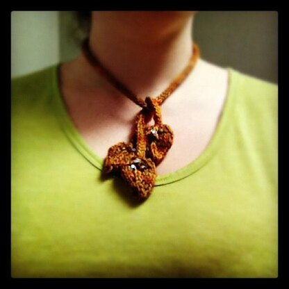 This pattern is designed to use just a small amount of luxurious yarn…perhaps a sampler or mini-skein of that beloved hand paint, or the leftovers from a favorite sweater. Though it is styled as a necklace in the photos, one could just as easily knit a longer icord for a belt or waist tie, or perhaps use it tied around ones’ hair. Beads can easily be eliminated if you don’t have any handy, but it does add a nice sparkle.