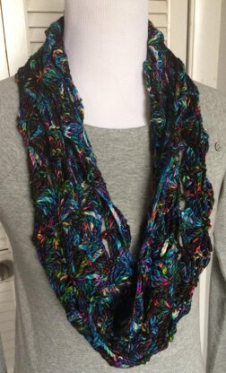 A wave pattern cowl created in long lacy treble stitches. The Cowl is joined at the end of the first row. Then it is worked in rounds, on the right side.