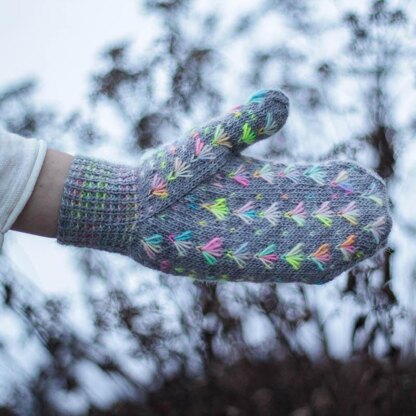 Elephant? But they are covered in flowers! The name may seem odd, but these mittens really were inspired by elephants. In India, there is a custom of painting ones elephant for special occasions. The chalky-bright paint in floral patterns on the rough grey skin is really stunning, and I wanted to recreate that effect in these mitts. This is why they are named Elephant Mitts.