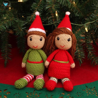 These elves are bound to get you in the holiday spirit! Each elf measures about 12 inches tall when legs are extended, including the hat. The legs are sewn on separately so they can sit independently, but they can also stand if leaned against something. This pattern includes instructions for the girl and boy elf. Most of the instructions are the same, except for the skirt/tunic and hair will have two separate sets of instructions depending on which elf you are making.