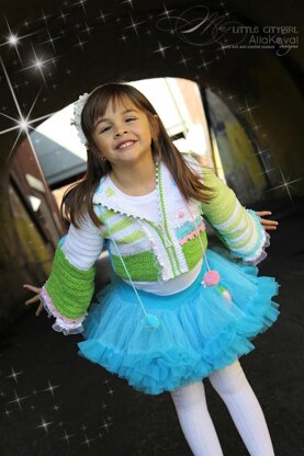 Elves love white. And red. And green. And all the colors in between! Jazz up the holidays with this delightful crochet jacket in traditional Christmas colors, or make it in your little elf’s favorite shades for year-round wear. The long hood and wide bell sleeves are just right for chilly days, especially when trimmed with scallop edgings, organza ruffles and matching zipper closure! Bobble stitches, pom-pom ties and vibrant patchwork details add the perfect finishing touches, and will keep her snug and cheery all season long. Instructions given for both turquoise, greens, white and red, greens, white color combinations.