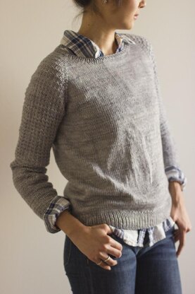The pulloever is knit seamlessly from the top-down, in one piece, beginning at the neck. The top of the yoke is worked back and forth while the neck shaping takes place, then the remainder of the yoke, body and sleeves are worked in the round. Stitches for the collar are picked up and knitted at the end.