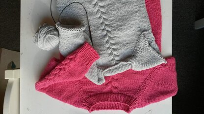 The samples are worked in a worsted weight cotton (but you can use wooly yarn as well), it’s knitted topdown and seamless. Neckline and longer back are shaped with short rows; increases are worked along the raglanseams. The stiches for the neckband are picked up and worked at the end.