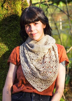 This modern interpretation of a collared wrap shawl, commonly worn in colonial times, begins with a collar formed of rows of front loop only slip stitches. A triangle of shells descends from the collar, gradually decreasing to a curved point. The solid, stretchy fabric of the collar adds weight to the silky lace, keeping it draped over your shoulders.