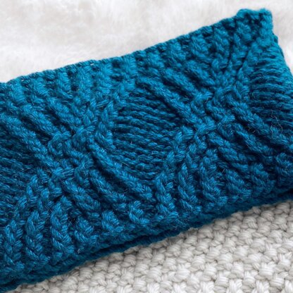 This knit headband features a ribbed crossover cable design. The soft cotton yarn makes for wonderful stitch definition and a cozy winter accessory.