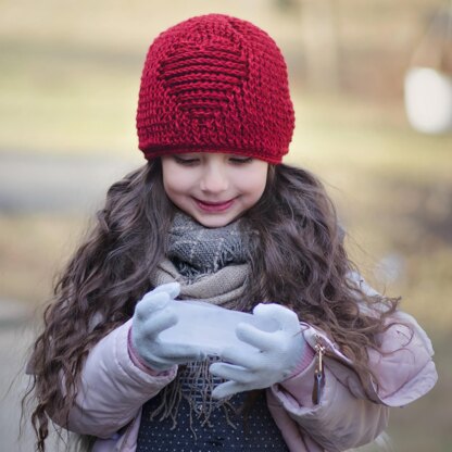 This is a PDF crochet pattern for a textured beanie with a subtle embossed heart design in 7 sizes.