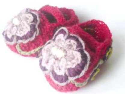 An easy pattern to knit slip on embroidered shoes with a strap. The embroidery is fairly simple: small amounts of spare DK yarn or tapestry wools in 6 colours required