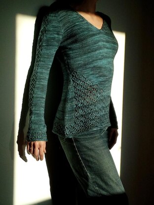 The design uses the contiguous method of shaping set-in sleeves developed by Suzie M. This sweater has a special construction. You are going to do a provisional cast on and knit the half of the sweater: that means half back, a shoulder and half front that you will knit twice. The neckline is made of lace with an I-cord so that you do not have to pick up sts to finish. Once you have got correct length of neckline, you will join to knit in round. Then you will separate the body and sleeves and knit the body in round until the end. You will knit a band of lace on the front that keeps going up. Because the sweater is reversible, you can choose to wear this lace on the front or in the back. The sweater ends with a lace band all around and an I-cord finish.