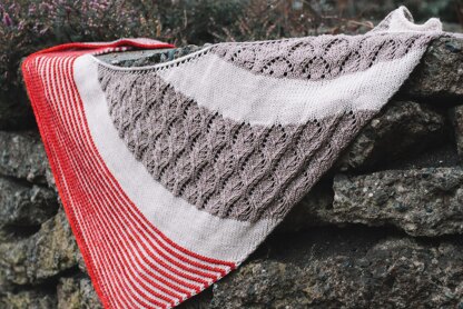 Enderby is a crescent shaped assymetrical triangle shawl knit with three colours.