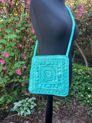 I wanted to design a functional, beautiful bag. The bag is made of two panels. Each panel starts as a spiral, and is then squared off. The bag uses some of my favourite crochet stitches: popcorns, back and front post trebles, and back loop stitches. The two panels, when completed, are crocheted together to make the bag, and then a simple drop-in lining is sewn and stitched to the bag opening. I wanted the design to be relatively straight forward, so that I could enjoy the rhythm of the stitches without constantly referring to the pattern, but that also included a little challenge. I used Scheepjes Softfun Denim for this, although it would also be a good stashbusting project. There are two versions of the pattern, one using UK terminology, one using US terms.