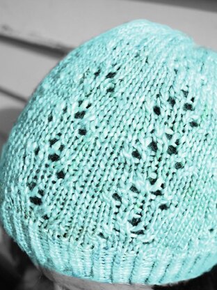 A lovely gentle slouch hat with a simple, easy to remember lace pattern knit in the round from the brim upwards. Perfect for knitters new to lace.