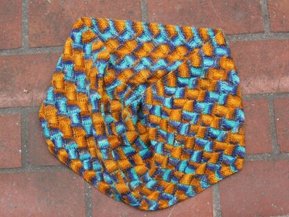 The color pattern will vary depending on your choice of yarn. The yarn used in the sample was fairly evenly split in quarters: dark, blue, dark, orange. Changing the number of repeats will also affect the resulting pattern.
