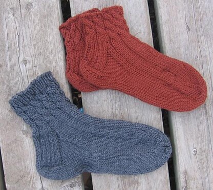 Pretty socks knit top-down in the round with mirrored cables. Work up quickly in worsted weight yarn at 6 st/inch. You could also use a sport/dk if you can get that gauge with them. I use these as slippers! they are quick to knit and comfortable to wear!